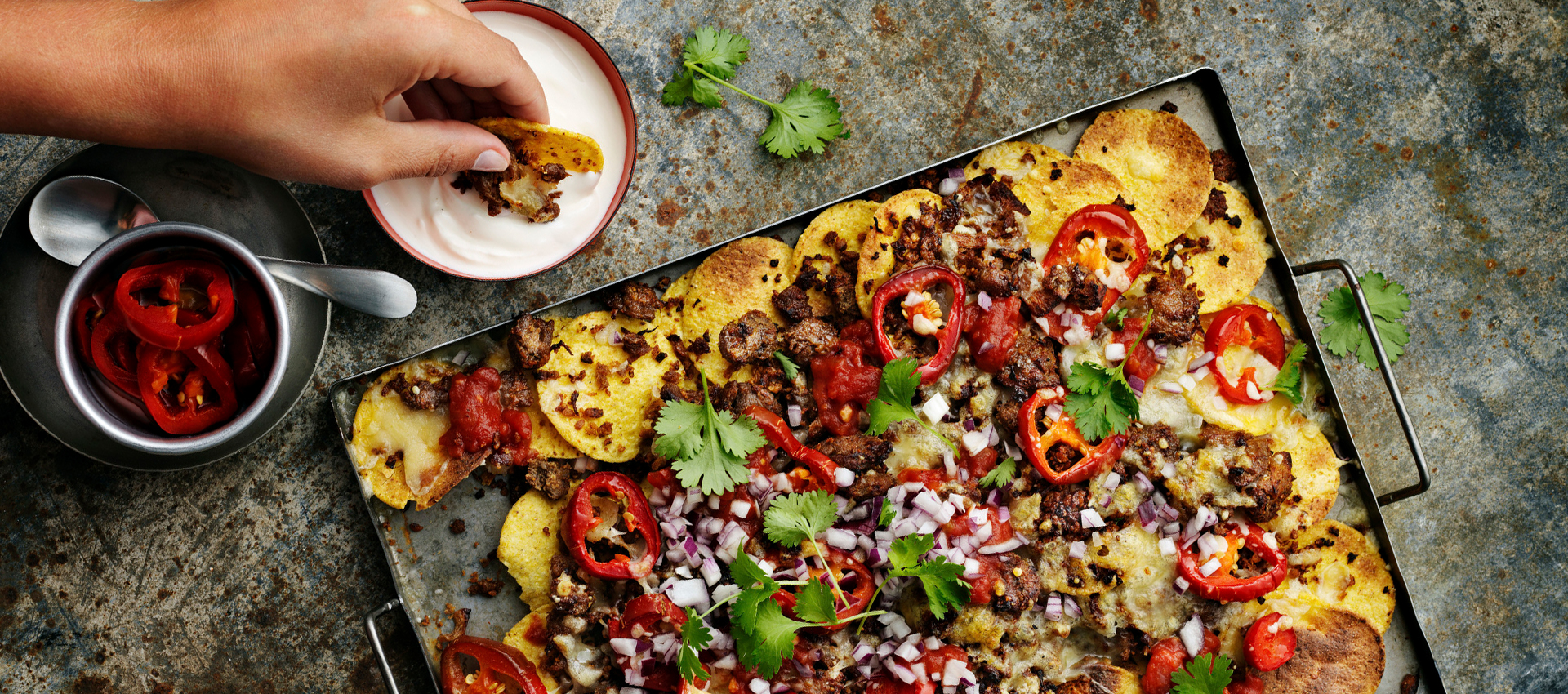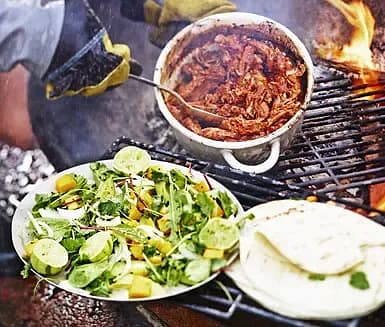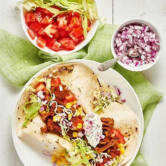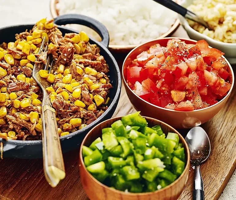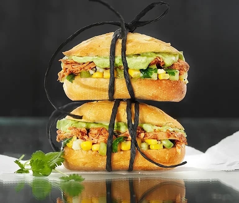 Pulled chicken burger med avokado, rostad majs och picklad lök