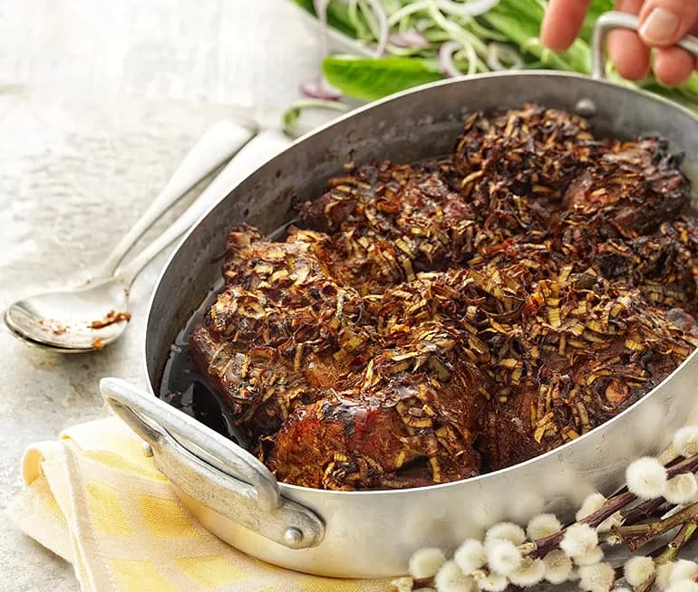 Fläskfilé-medaljonger med senapssky och gräddkokt purjolök