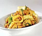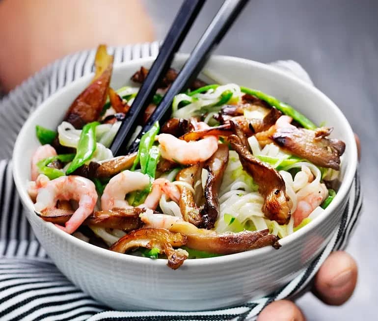 Risnudlar med ostronskivling, purjolök och sockerärter