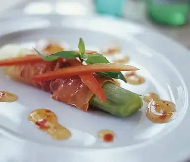 Dill och rosépeppargravad gös med bakad purjolök och mandeldressing
