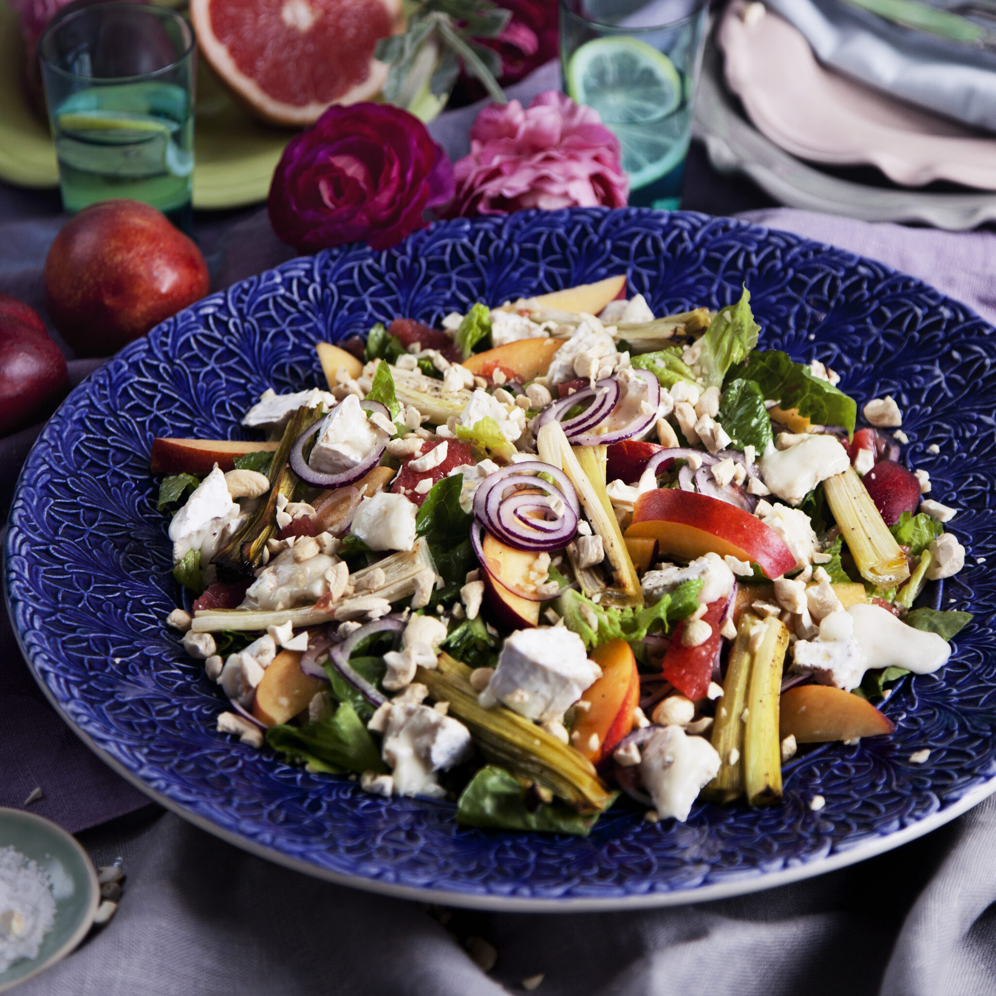 Sensommarsallad med bakad purjolök, nektarin, getost och blodgrape