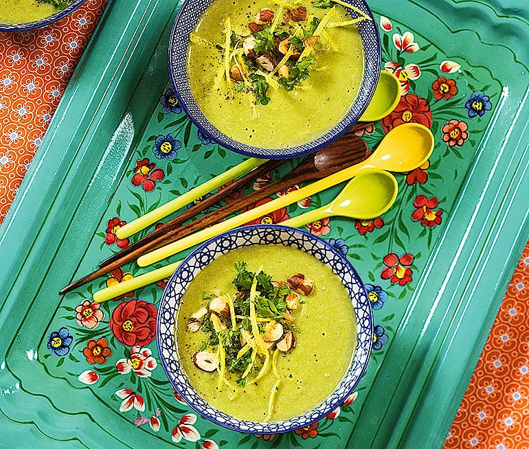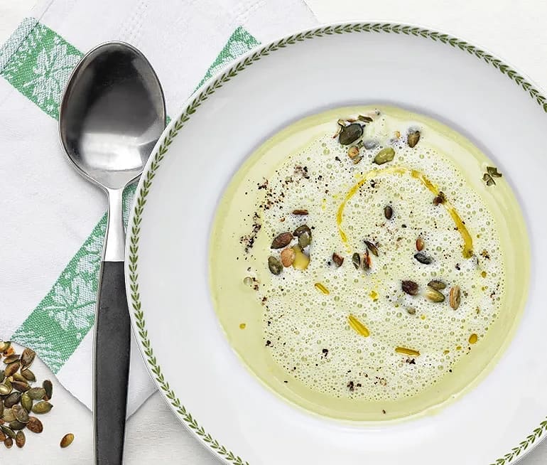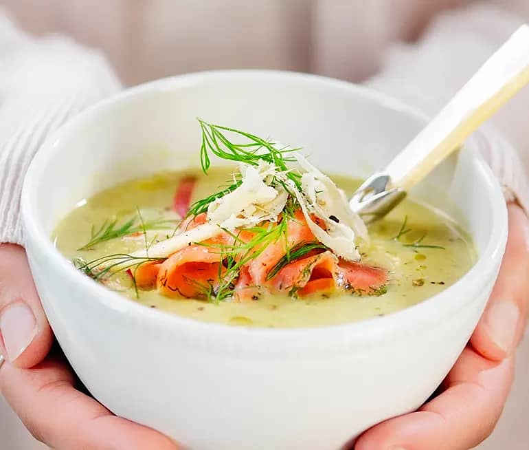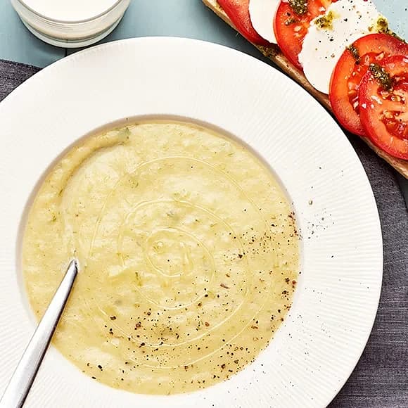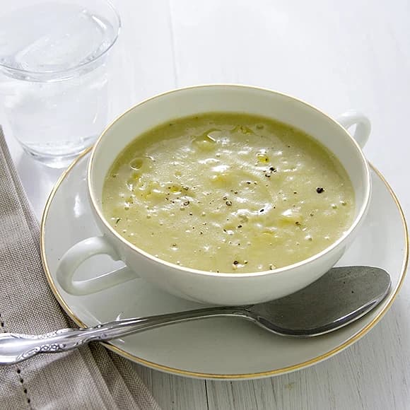 Potatis- och purjolökssoppa med vitlökschampinjoner