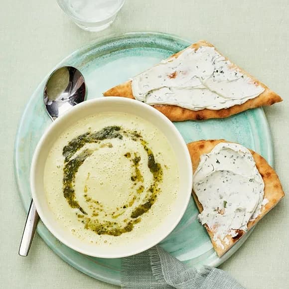 Potatis- och purjolökssoppa med bönhummus på knäcke