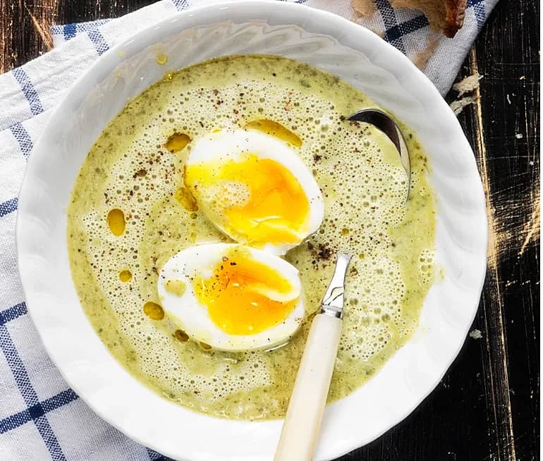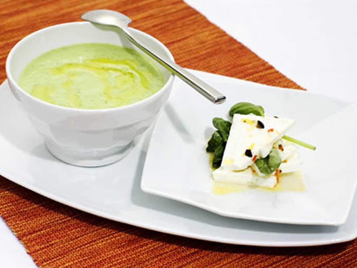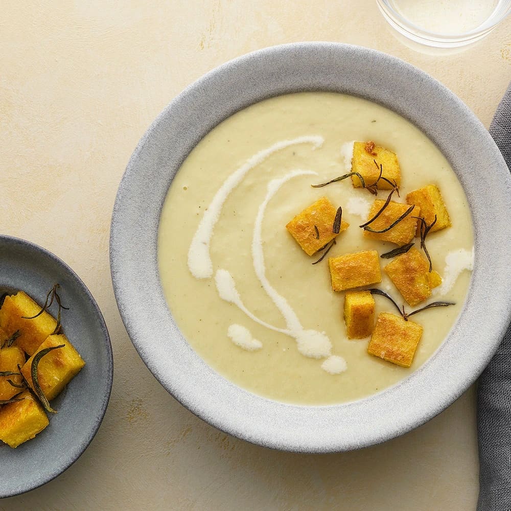 Potatis- och purjolökssoppa med vitost, krutonger och krasse
