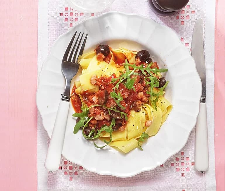 Puttanesca med torrsaltat bacon och oliver