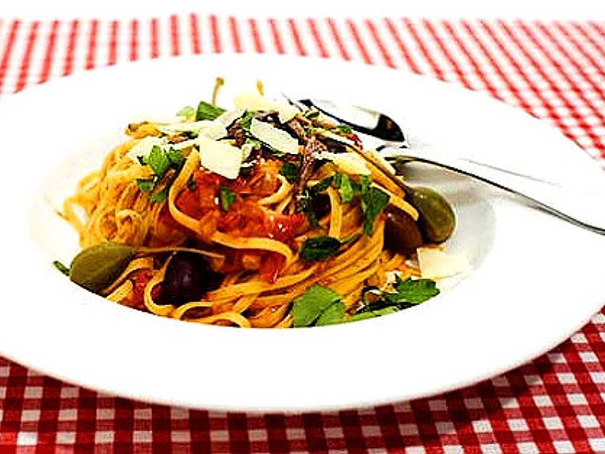 Puttanesca – pasta med tomater, kapris, sardeller