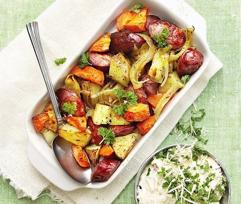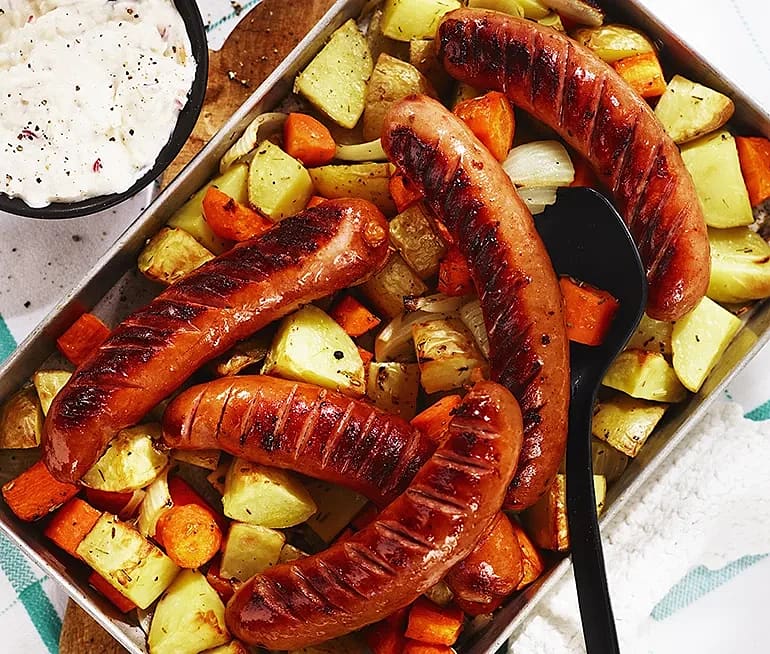 Rostad pytt med bratwurst och pepparrotskräm