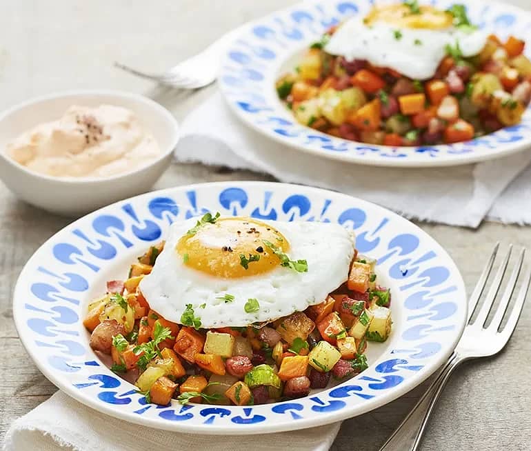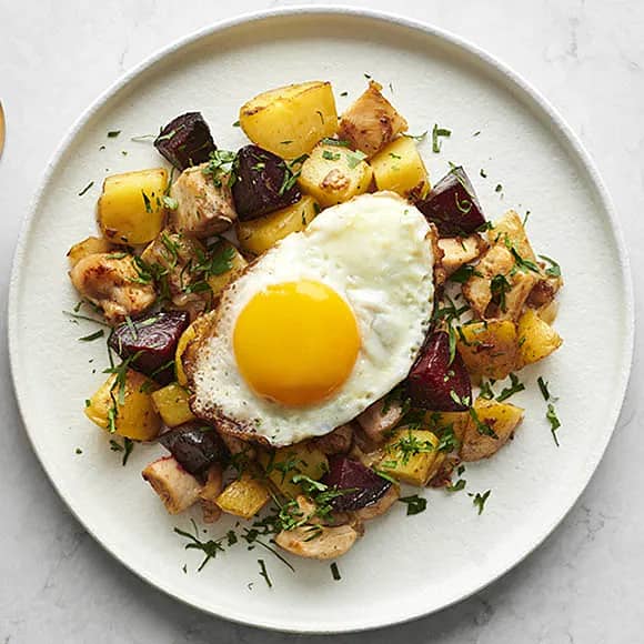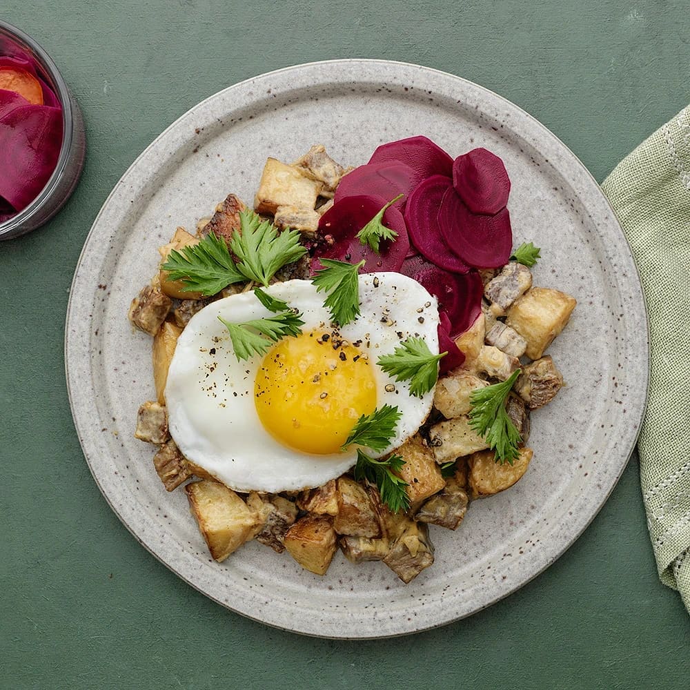 Pyttipanna med sidfläsk, stekt ägg och rödbetor