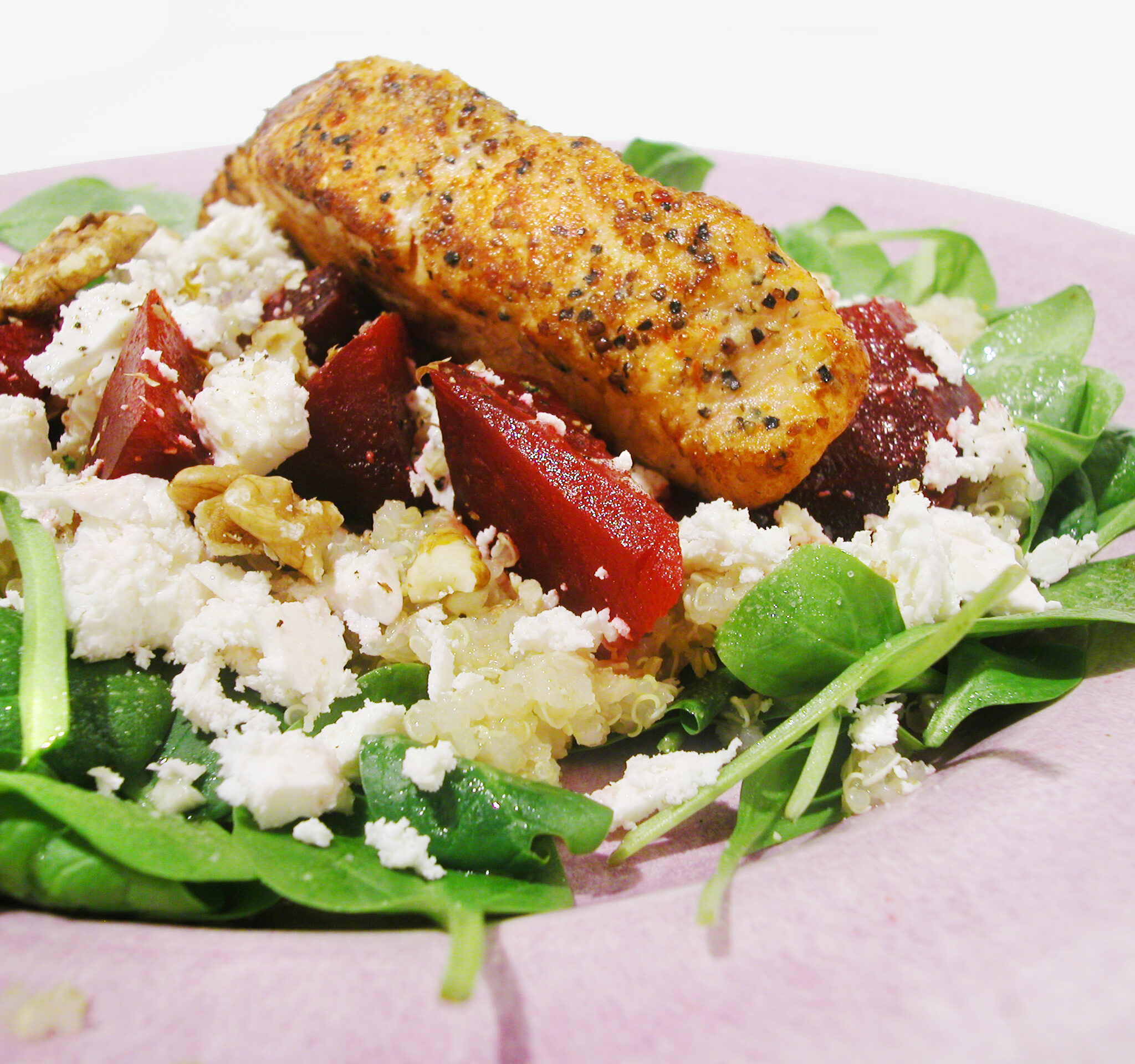 Lax på rödbetssallad med quinoa, spenat, fetaost och valnötter