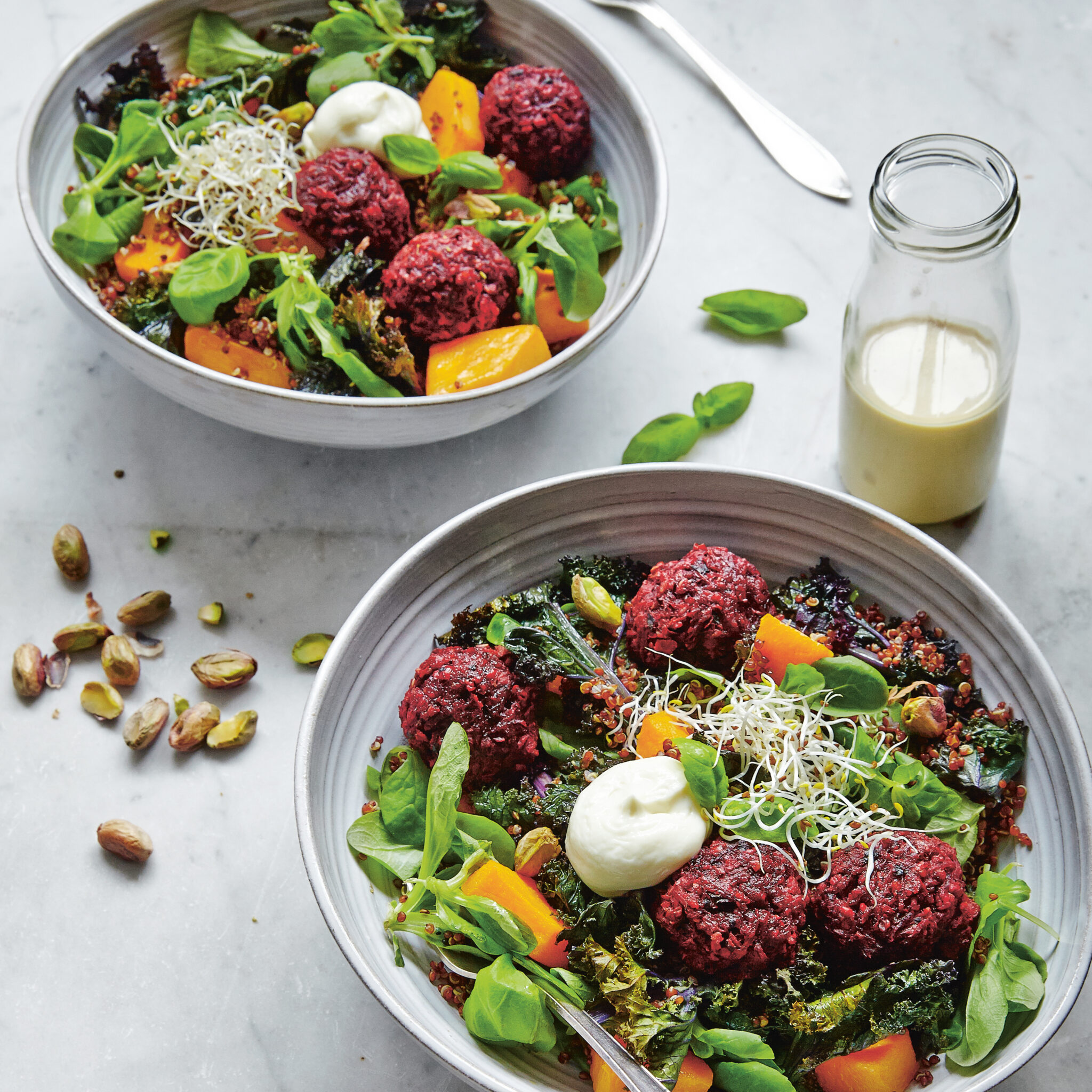 Pumpabowl med quinoa, rödbetsbollar och getostkräm