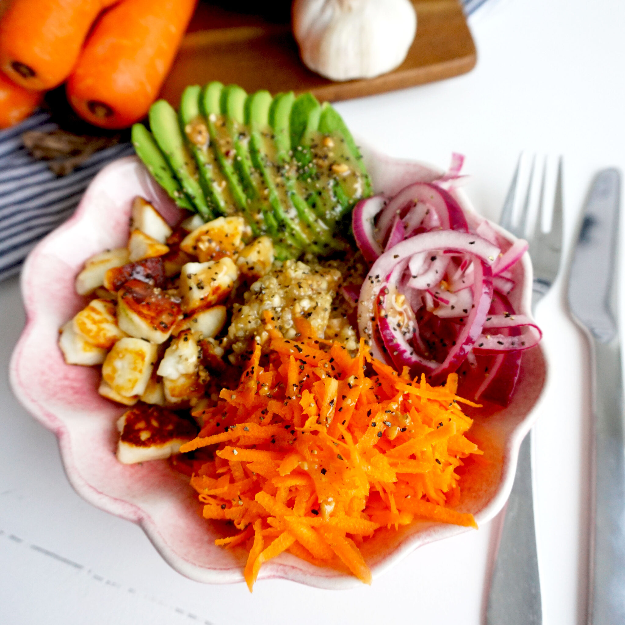 Halloumibowl med avokado och quinoa