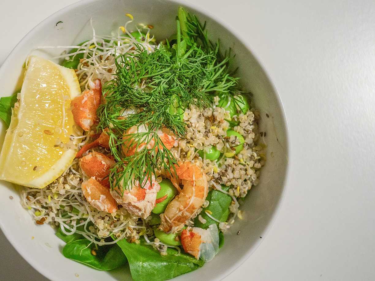 Sallad quinoa tricolore med mango och räkor