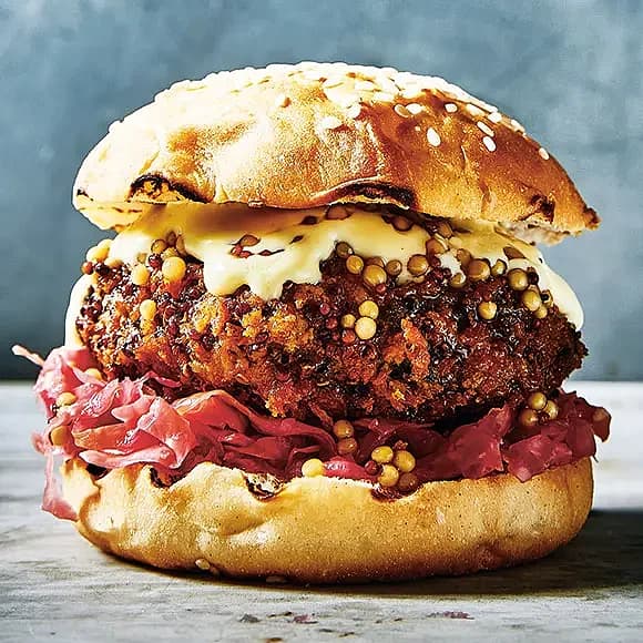 Svamp- och quinoaburgare med picklade senapsfrön och vitlöksmajonnäs