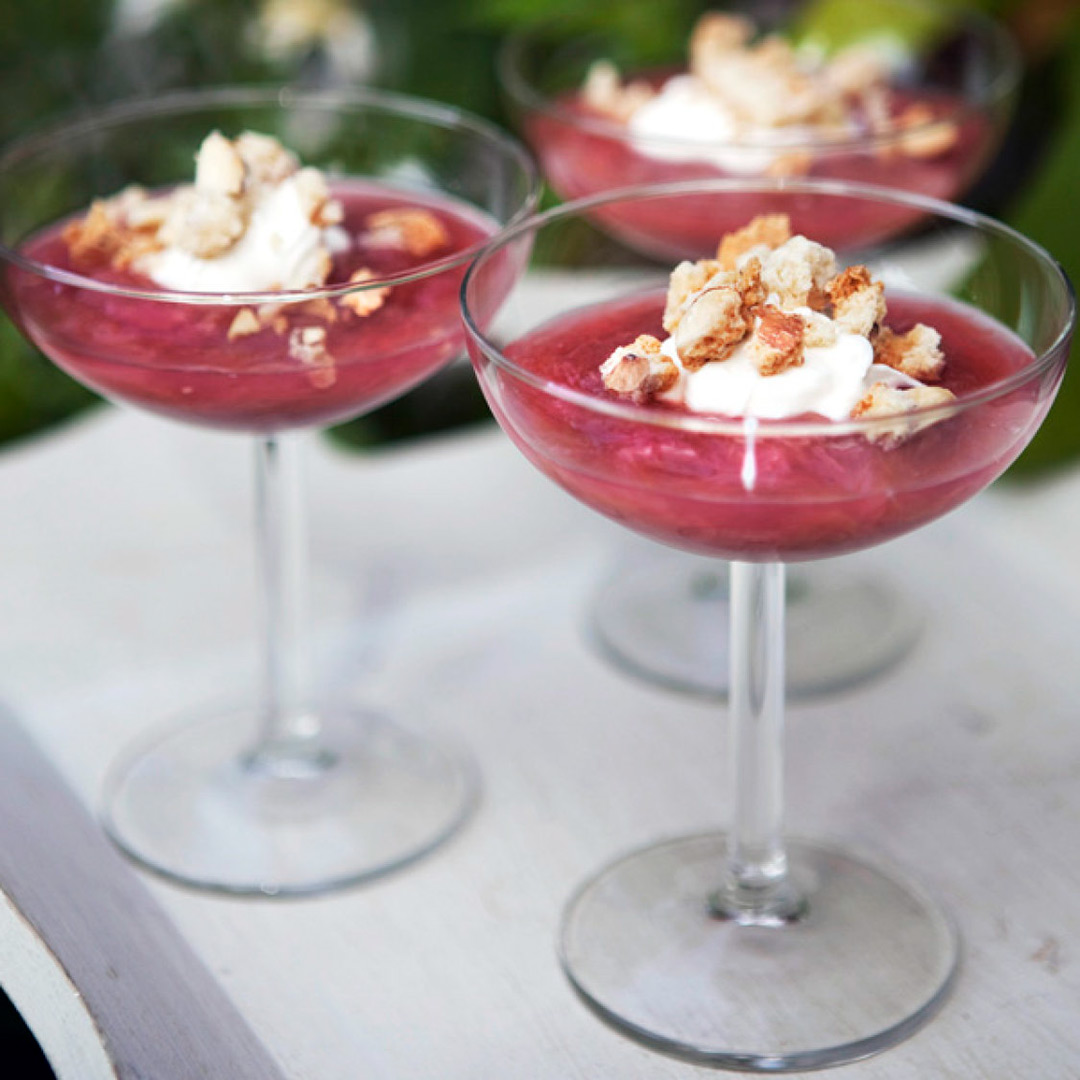 Rabarberkompott, jordgubbar, vanilj och mandelcrumble