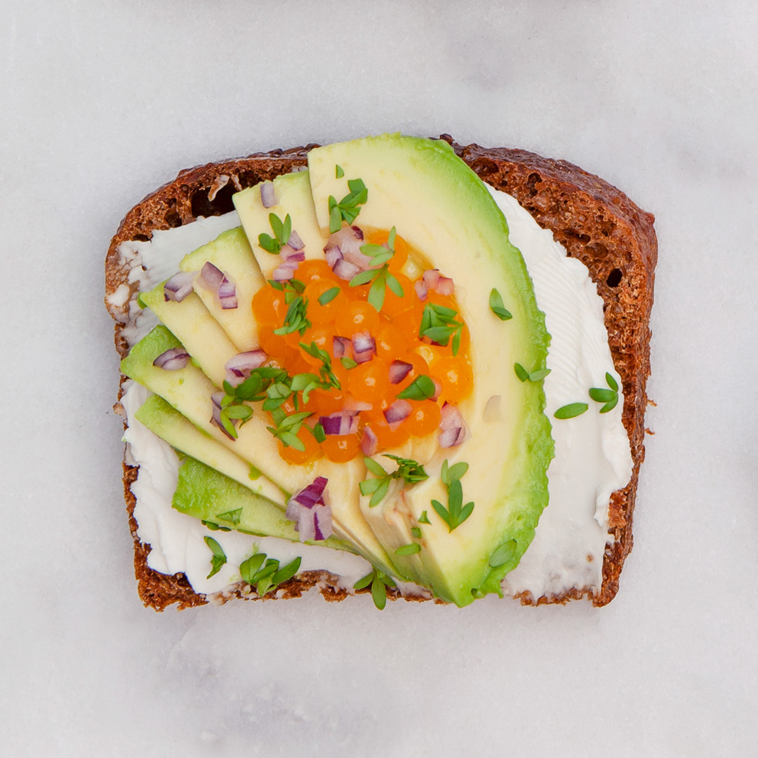 Mörkt rågbröd med avokado och tångpärlor