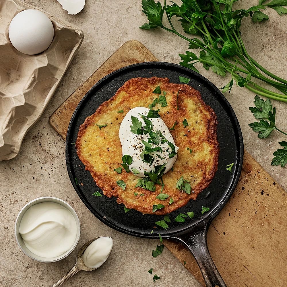 Raggmunkar serverade med äggröra och picklade grönsaker