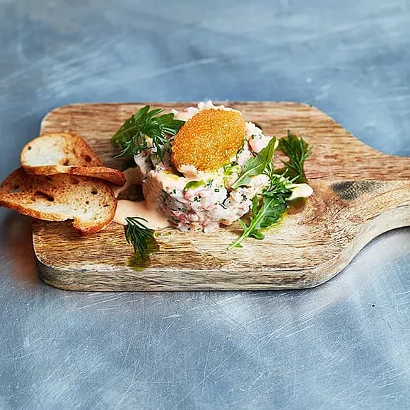 Räktartar med brödchips, dillolja och räkmajonnäs