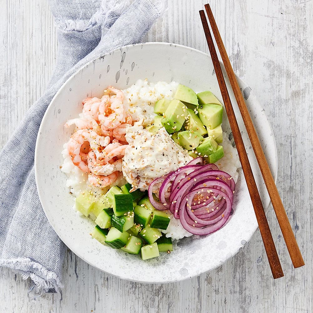 Risbowl med räkor och rostad lökmajonnäs