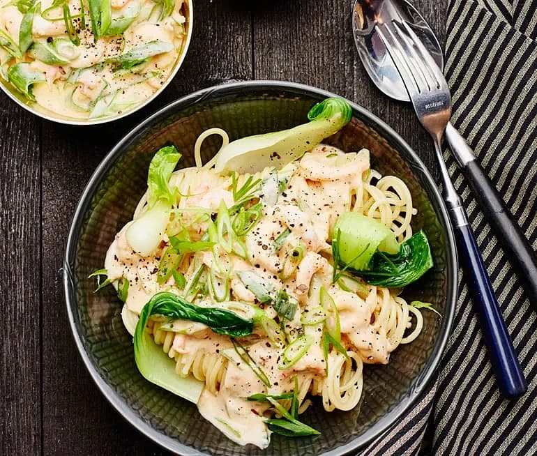 Krämiga räkor med pasta och pak choi