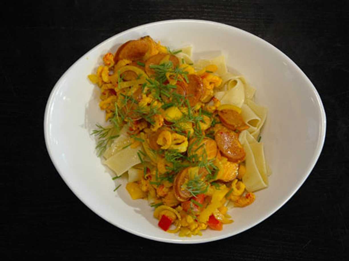 Saffranspasta med kyckling och räkor
