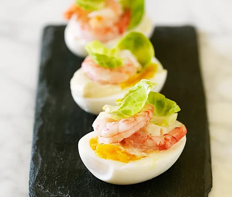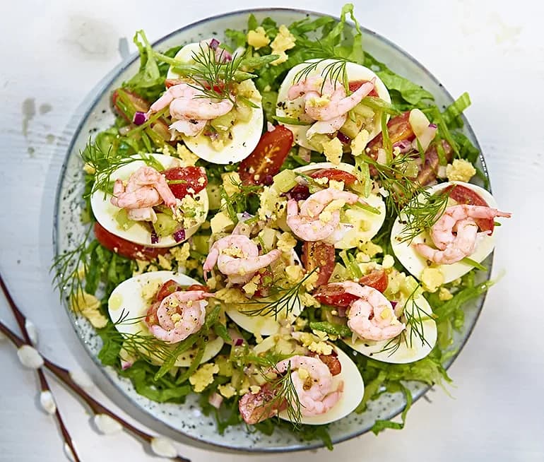 Fyllda ägghalvor med räkor och grönsaksvinägrett