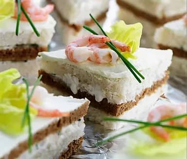 Smörgåstårta med varmrökt lax, räkor och pepparrot