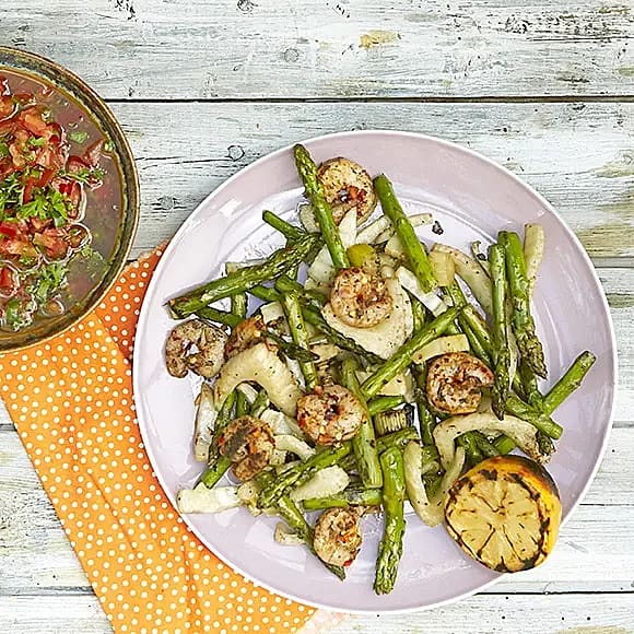 Grillad räksallad med sparris, fänkål och pebre