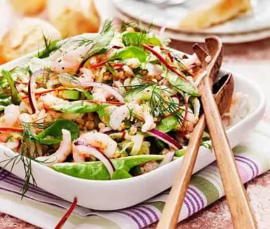 Syrlig räksallad med bulgur och het mangodressing