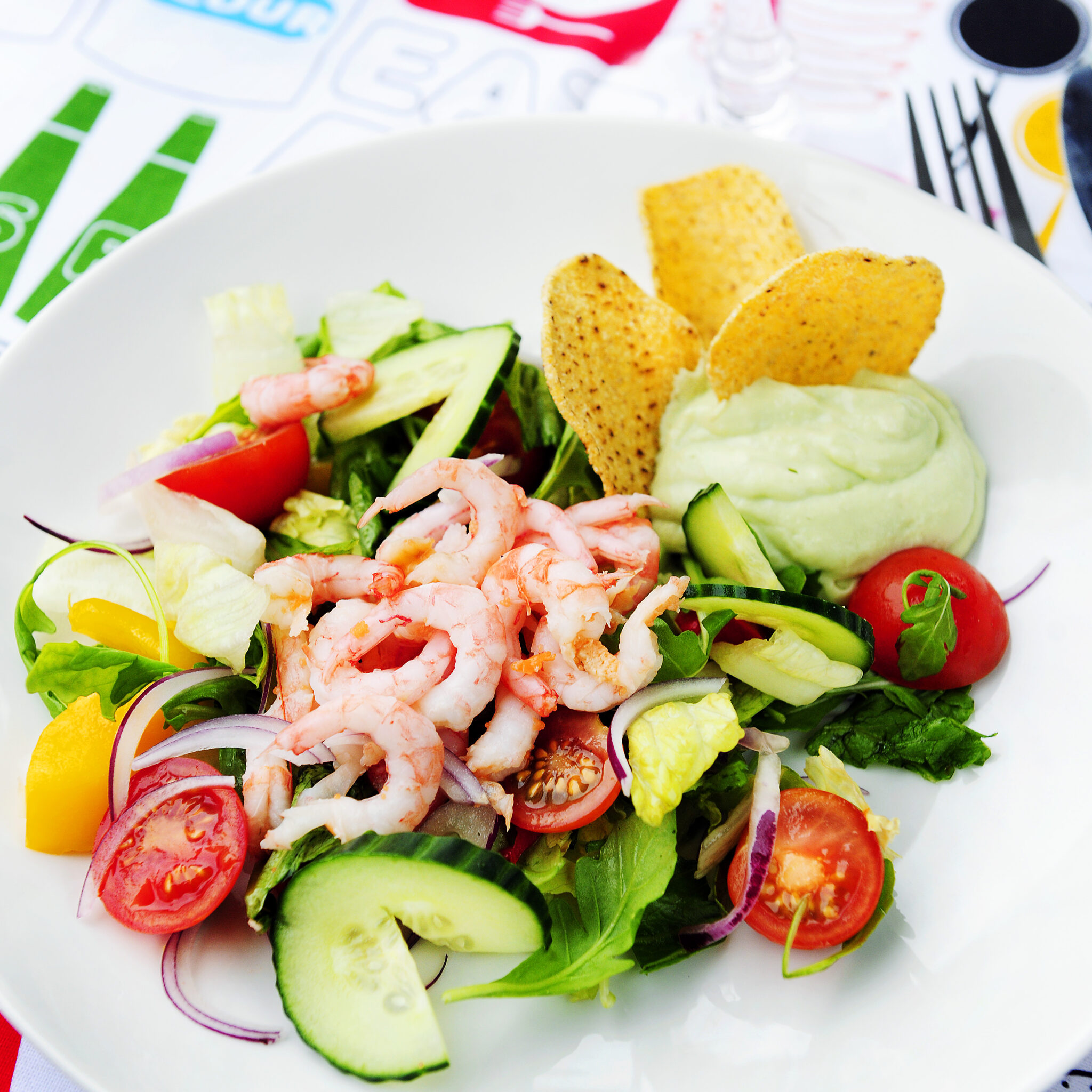 Räksallad med avokadodip och tortillachips