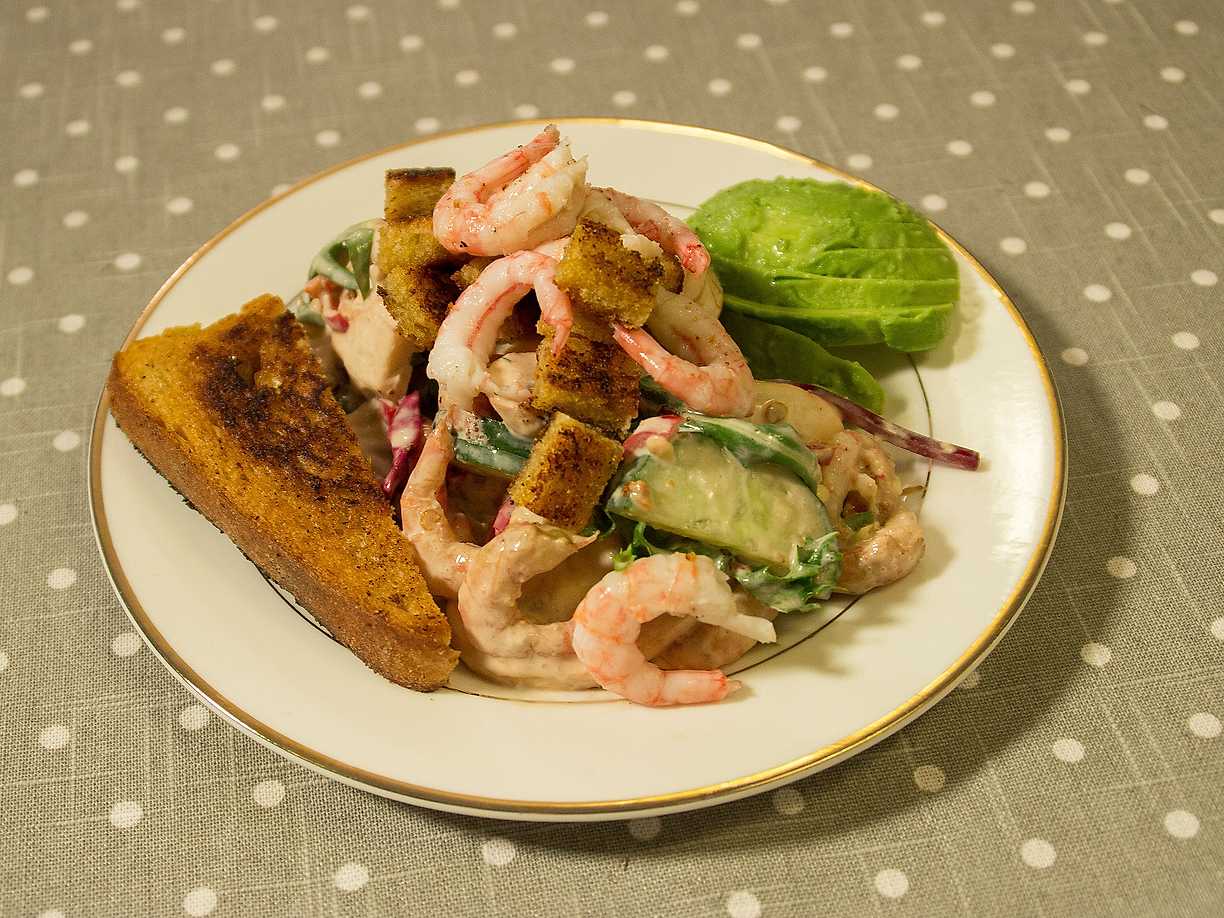 Räksallad med limedressing och vitlöksbröd