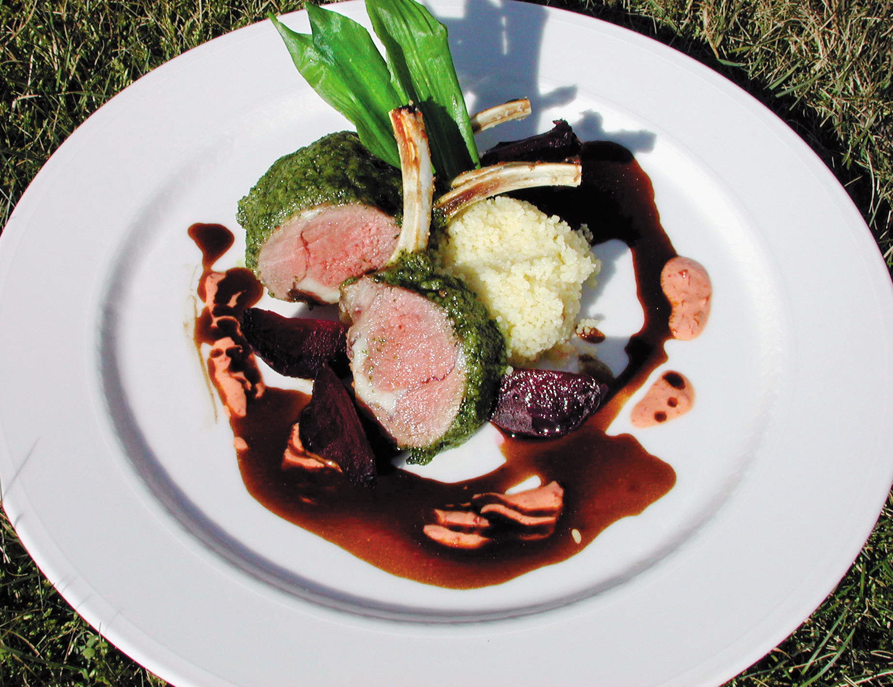 Ramslök- och honungsöverbakad lammkotlettrad med bakade rödbetor och chilicrème