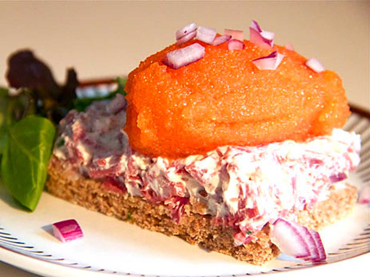 Ägghalvor fyllda med rökt lax och pepparrot eller rökt renstek och äpple
