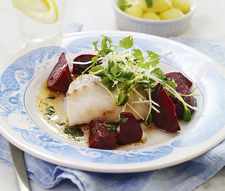 Halstrad rimmad torsk serveras med ljummen sallad på hummer, blomkål och tryffel samt potatispuré