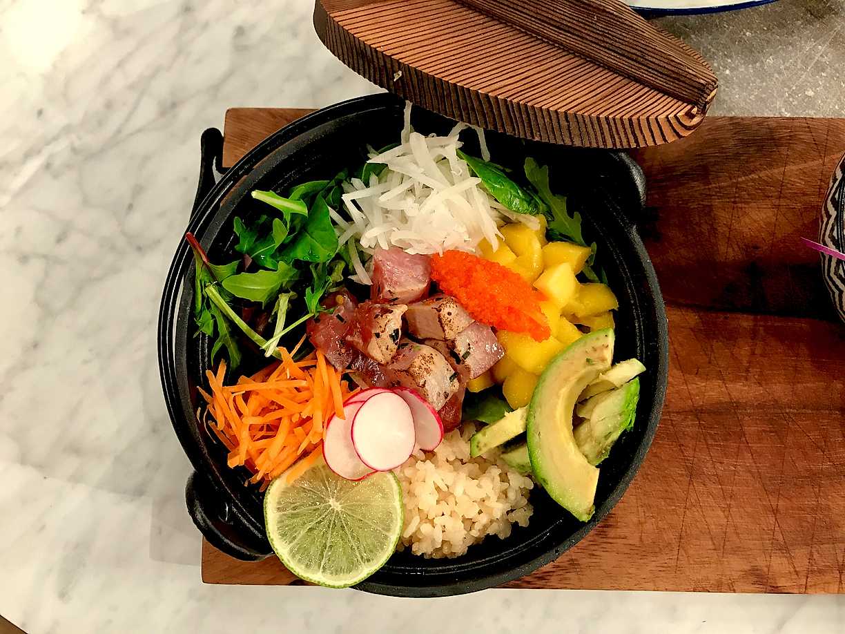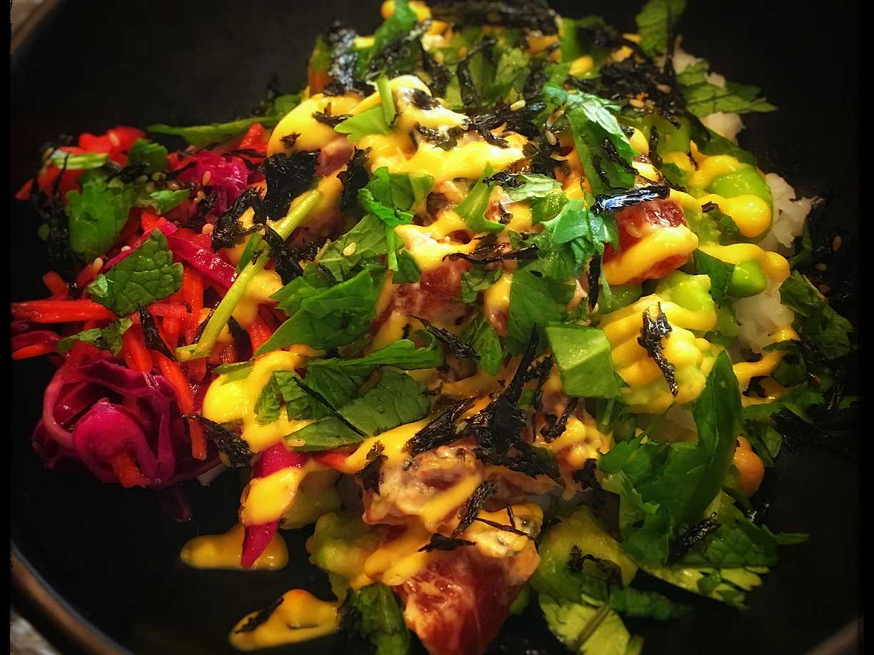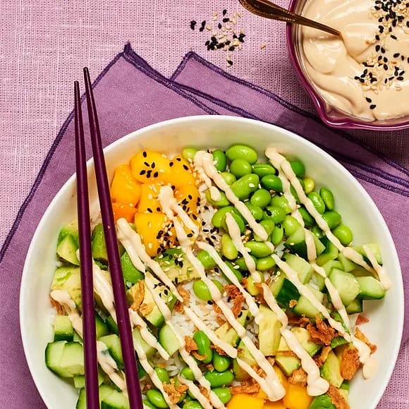Poké bowl med marinerade böngroddar och sojamajonnäs