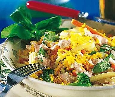 Stekt korv med curry, grönsaker och ris