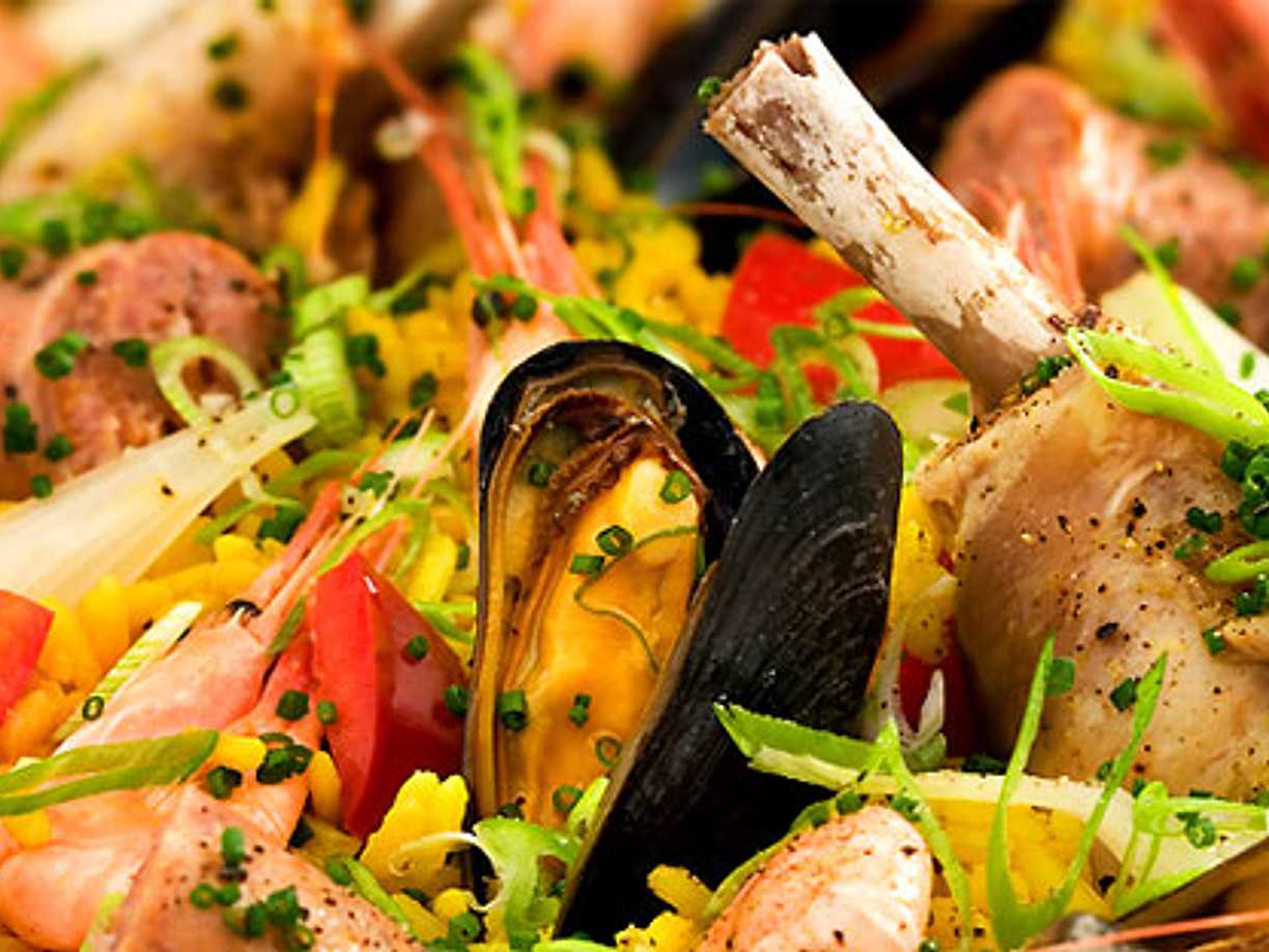 Paella med kyckling, räkor och två sorters musslor