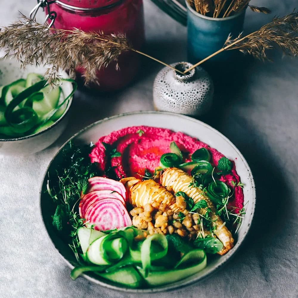 Bowl med rödbetshummus och tempeh