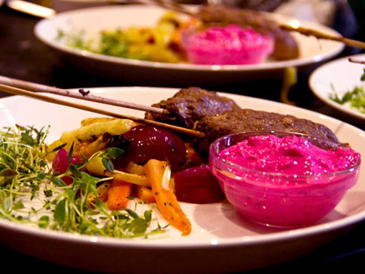 Viltsouvlaki med rödbetstzatziki