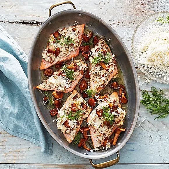 Smörstekt röding med rostad pumpa och kantarellstuvning