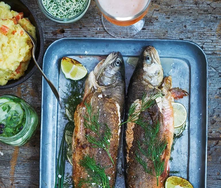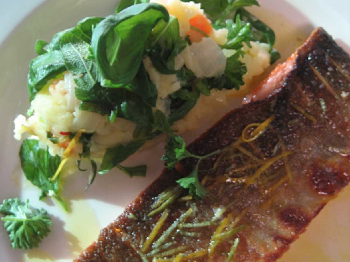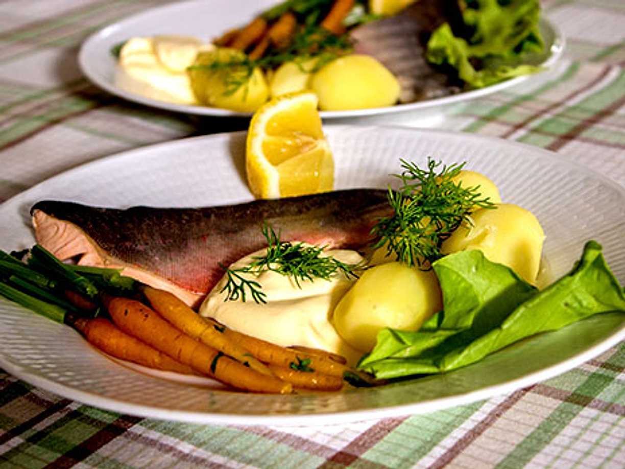 Fänkålsbakad röding med råraka samt äpple- och pepparrotssmetana