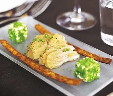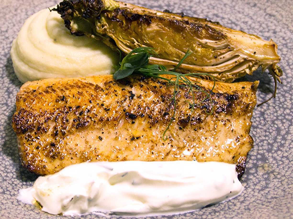 Röding med messmörs- och gräslökssås, rotfruktsstomp och inlagd enbärsgurka