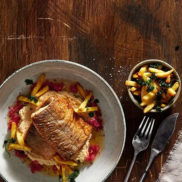 Halstrad röding med rostad mandelpotatis, romcrème och citronmarinerad salladslök