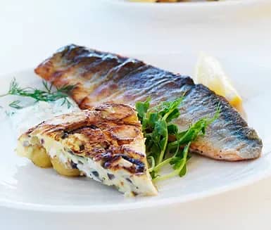 Röding med mandelpotatisomelett och pepparrots crème fraiche