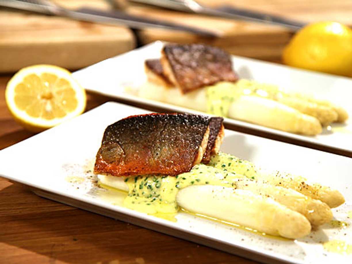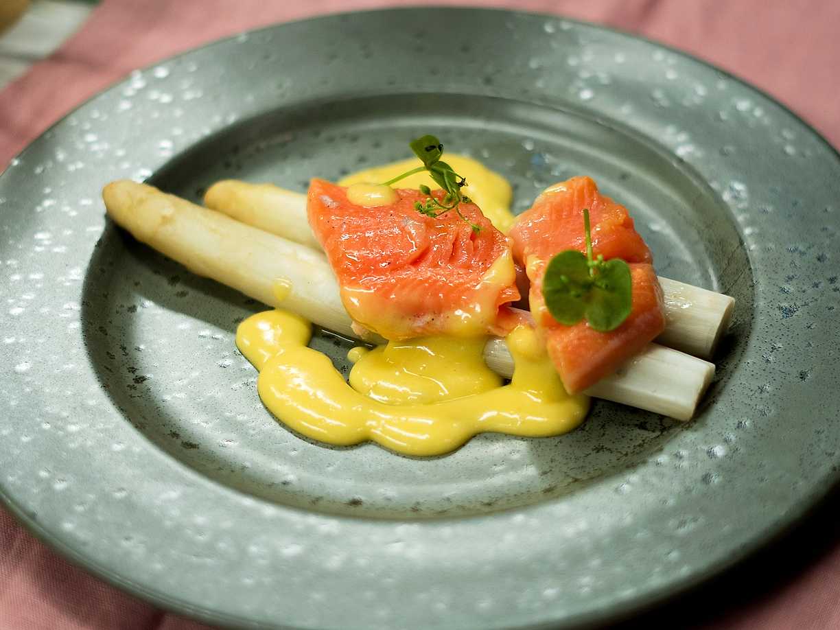 Vit sparris och lättrimmad röding med lime- och apelsinhollandaise