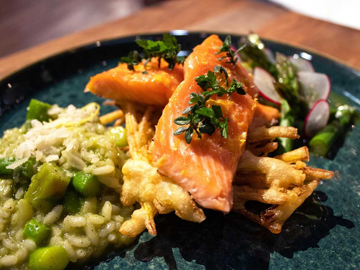 Lättrökt röding med friterade purjolöksknyten och sparrisrisotto
