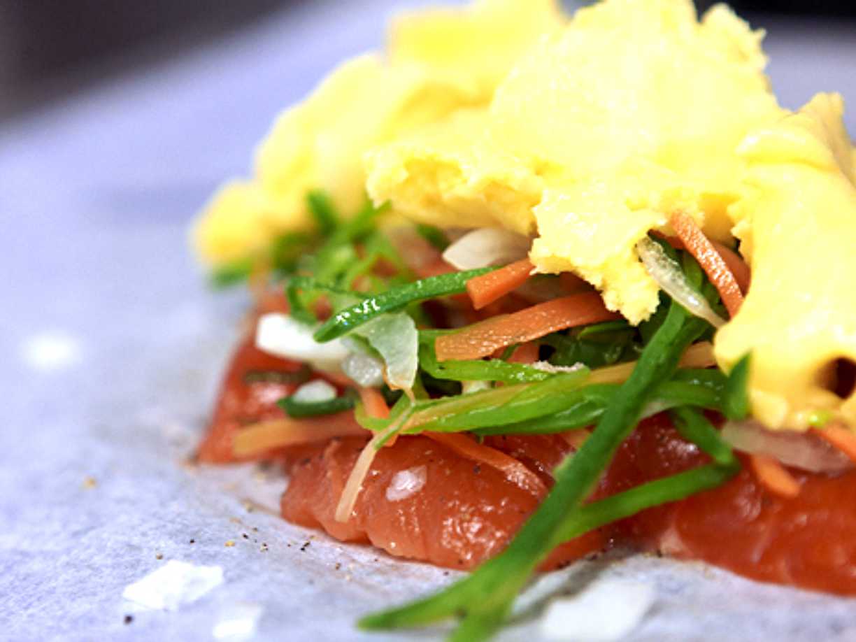 Lättgravad rödingtartar med rökt vaktelägg, dillmajonnäs och friterad rödbeta