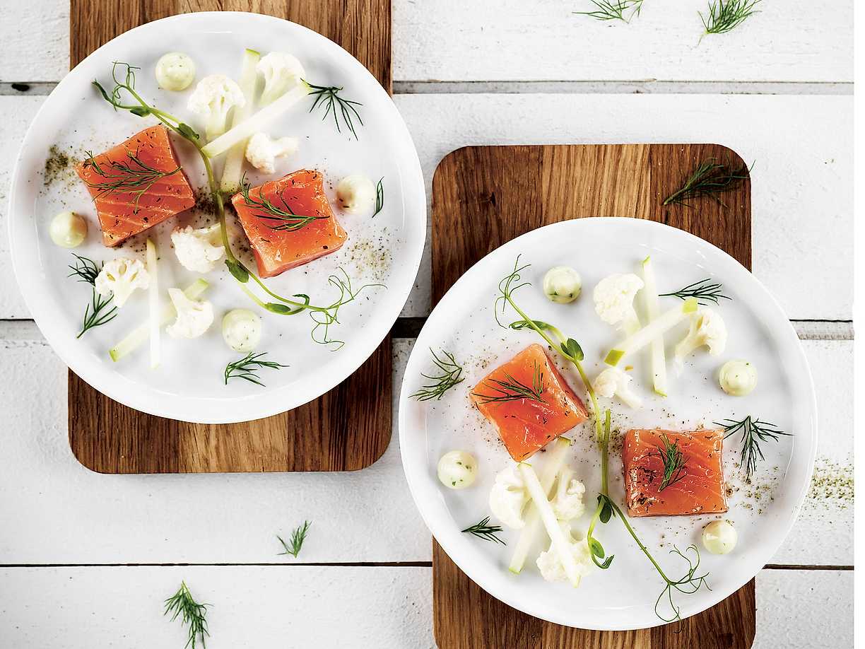 Lätt gravad rödingfilé med syrat äpple och blomkål