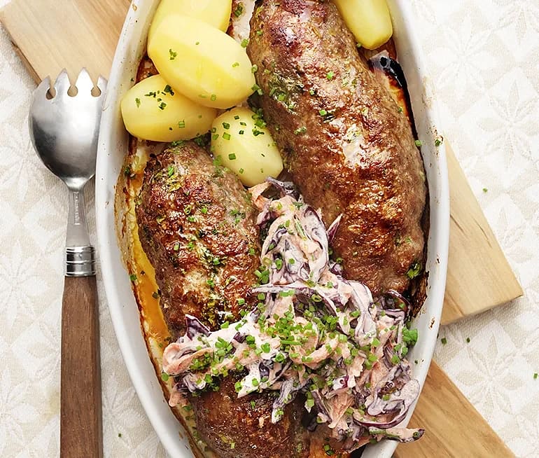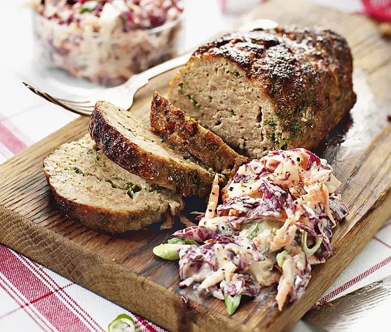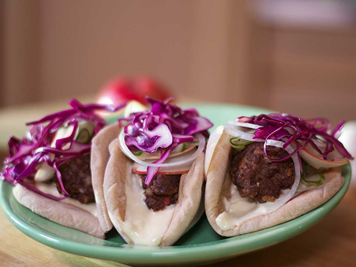 Amirs fläskfärslimpor med coleslaw på rödkål och ingefära