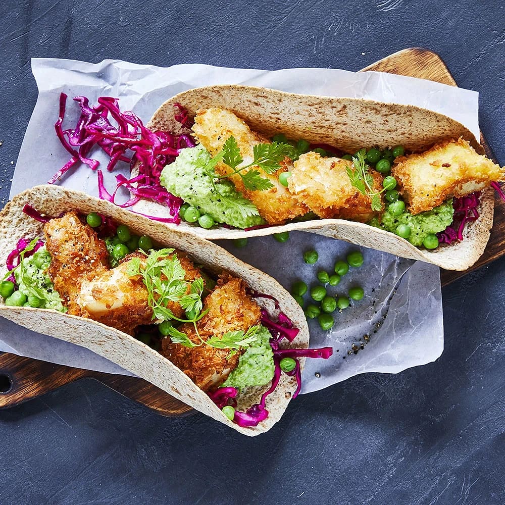Vegetarisk taco med ärtguacamole och sötsyrlig rödkål