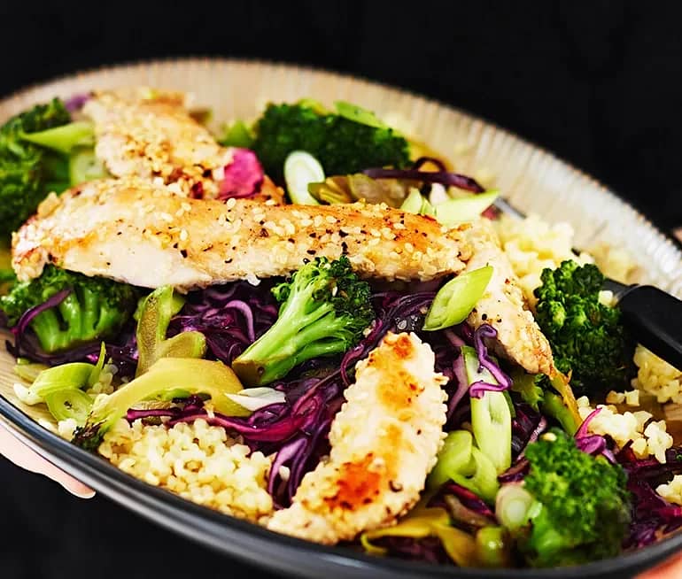 Sojafräst broccolisallad med rödkål, bulgur och sesamkyckling